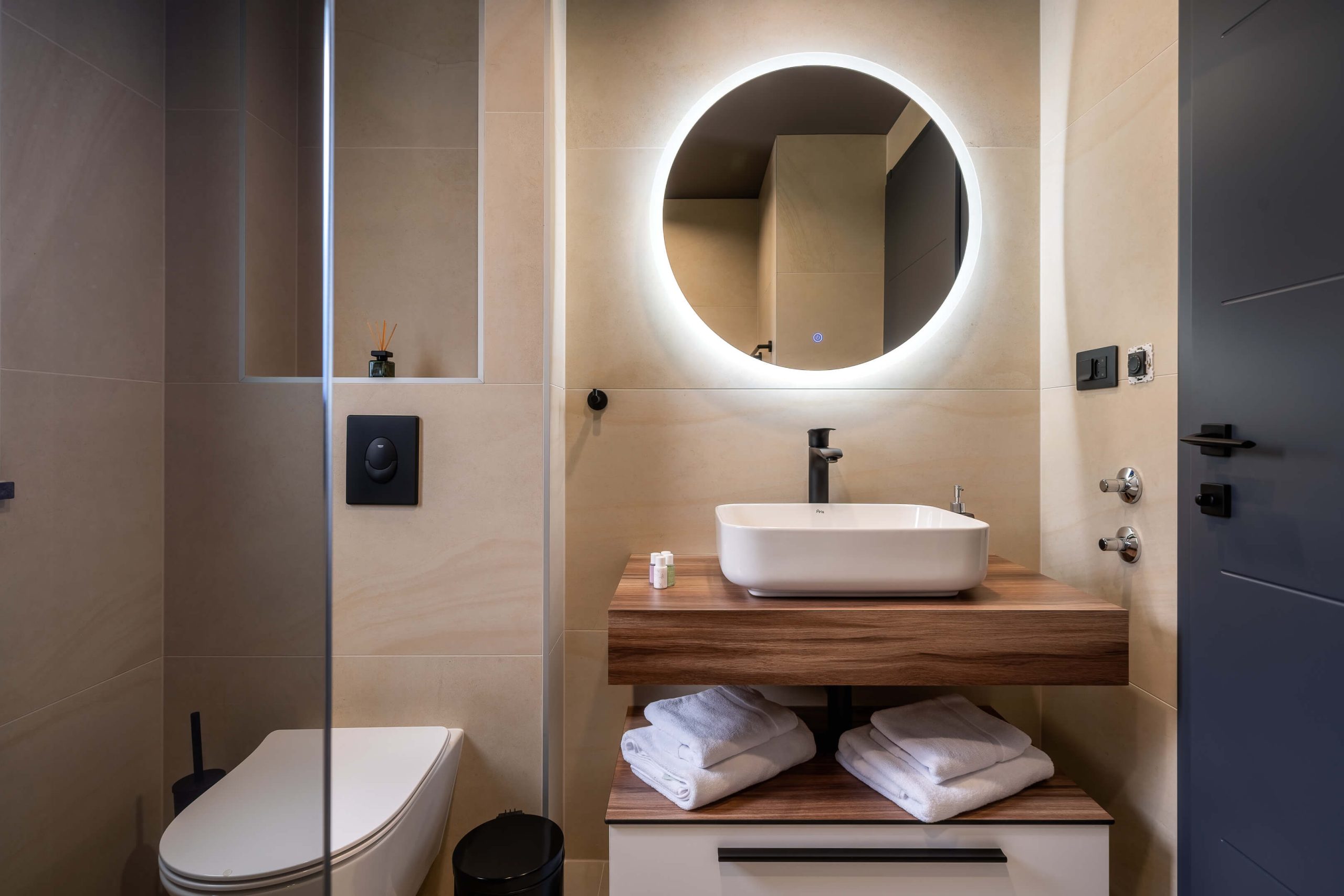 Naša moderno uređena kupaonica spaja minimalistički dizajn i prirodne materijale, s prostranom tuš kabinom od kvalitetnog stakla te drvenom konzolom s umivaonikom. LED ogledalo s ambijentalnim osvjetljenjem osigurava ugodnu atmosferu, dok svježi ručnici i luksuzna kozmetika pružaju dodatnu udobnost. Sve je pomno odabrano kako bi prostor bio funkcionalan i estetski ugodan.